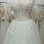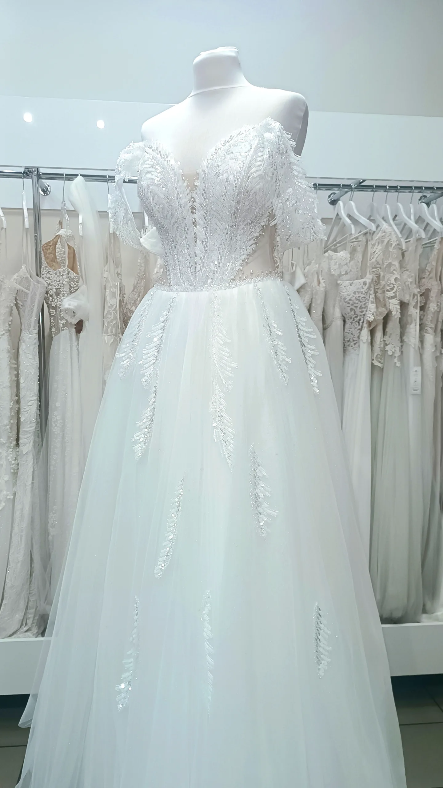 Cała suknia zachwyca ręcznie naszywanymi dekoracjami, koralikami oraz brokatowym wykończeniem, dzięki którym model lśni przy każdym ruchu, tworząc zjawiskowy, luksusowy blask. Bogato zdobiona góra w połączeniu z obszerną, migoczącą spódnicą dodaje sylwetce lekkości i jednocześnie efektownie ją wydłuża.