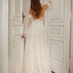 Model Haze to suknia, która zachwyca romantycznym charakterem. Fason litera A wykonany z brokatowego tiulu prezentuje się bajkowo, a ciepły odcień brzoskwini (z możliwością zamiany na śmietankowy) dodaje całości delikatności. Suknię zdobią liczne aplikacje kwiatów 3D z bogato zdobionymi środkami wyszywanymi koralikami. Balonowe rękawy podkreślają jej romantyczny styl, czyniąc z Haze wyjątkową propozycję dla Panien Młodych z Radomia poszukujących oryginalnej, a jednocześnie niezwykle kobiecej kreacji.
